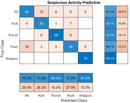 The performance of the proposed GoogleNet–BiLSTM network in terms of the state-of-the-art machine learning evaluated metrics listed in Table 4 [7]. The performance of the proposed network is detailed in Table 5. The experimental result shows that the proposed system best classifies the “kick” category. The average classification accuracy is 73.15%. The average sensitivity, specificity, false positive rate, and false negative rate are 71.52%, 72.22%, 28.48%, and 27.78%, respectively.