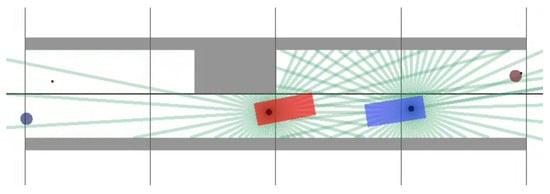 The multiagent maneuvering environment with an example scenario of a bottleneck and two cars trying to negotiate safe passage through it. The color-coded goals of the respective agents are shown in the form of circles, while the green rays are the visualization of the freespace observation.