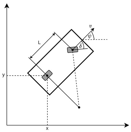 The state of the motion model consisted of the position of the center of the rear axle in the global coordinate system, , with orientation angle . To track the dynamic state of the car, the state also consisted of v, a variable that represented the magnitude of the velocity and the yaw rate . The angle of slipping was not modeled. The control was defined as a, representing the acceleration command, and the angle of the wheel . The model was parameterized with the wheelbase (distance between axles) of the car, L. The symbol represented the amount of time to be simulated. A graphical representation of the bicycle model is shown in Figure 3, while the state dynamics were represented by the following equations: