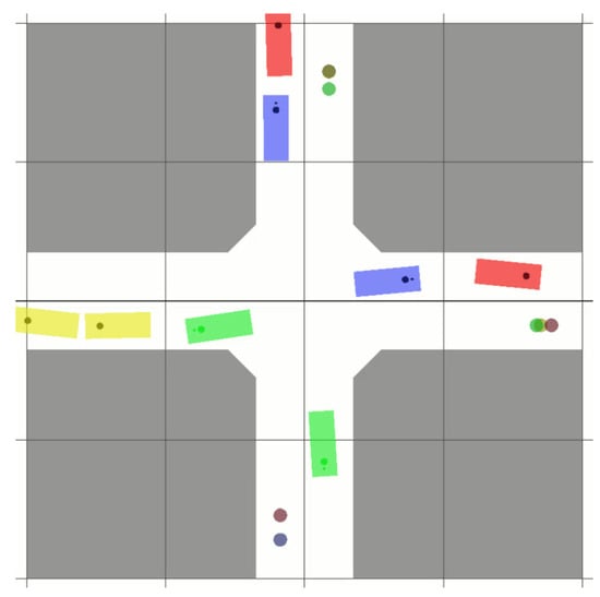 The crossroad scenario, with multiple agents each aiming at a different end goal, which is color-coded.