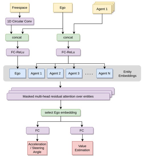 The neural network architecture was based on the one proposed in [] and is presented in Figure 7. Freespace observation, represented as 50 rays encoding the distance to obstacles, is processed with the use of 1D Circular Convolution and later concatenated with the observation of the ego itself. The other agents’ data are similarly embedded together with ego to corresponding embeddings. Defined in such a way that the entity embeddings are processed with the use of three masked multi-head attention layers, assuring that the eventual nonvalid objects are not a part of the processing. Later, embedding corresponding to the ego is selected and processed with fully connected layers to acquire discrete distribution over the actions (acceleration and steering angle combinations) and the value function estimation itself.