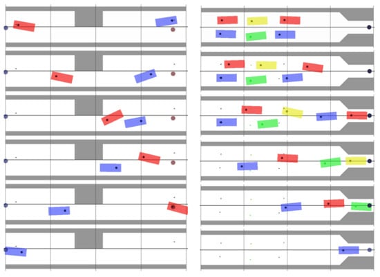 In the zipper scenario (Figure 5), agents must cooperate to merge from two lanes into one. Six agents were being simulated, in two lanes, respectively, with the singular location of the goal located within the narrowing, which was placed at one end of the road. The single-lane section was simulated on the left, center, and right sides of the road with the option of not narrowing.