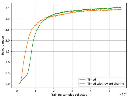 Experiments with time-based rewards were performed in crossroad scenarios. The main difference in the conducted experiments is summarized in Table 3. We compared the agent’s performance with and without the reward-sharing mechanism, also referring to baseline training (Section 5.1). For the reward-sharing training, we used team spirit . The reward progress is presented in Figure 9, suggesting that reward sharing improved the end performance.