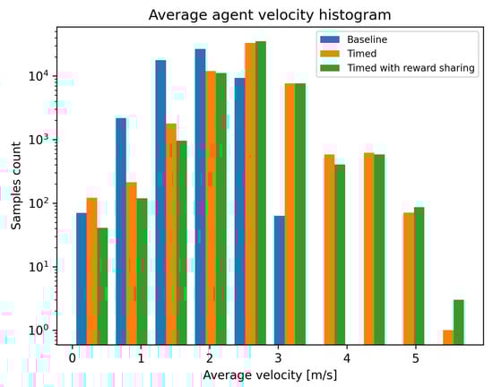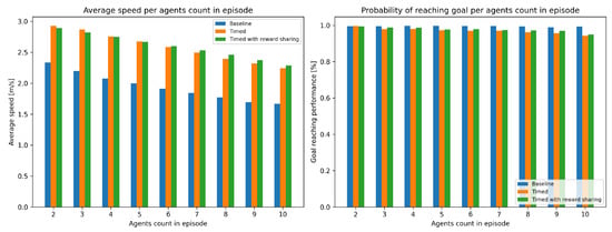 In detail, we performed an evaluation for each of the policies. We evaluated the policies on 10,000 episodes, which resulted in around 56,000 agent trajectories. The evaluation results are shown in Table 2. As expected, Baseline training showed a much better performance in achieving the goal and resulted in fewer collisions. At the same time, the Timed and Timed with reward sharing policies presented much higher average velocities and smooth behavior, with an advantage over the reward-sharing policy (see Figure 10 for histogram velocity). We also evaluated the average velocities and the probability of achieving the target aggregated by the number of agents in the episode (Figure 11). This evaluation showed that the reward-sharing mechanism introduced the most benefits with respect to the mean speed in high-density scenarios, while in less crowded scenarios, it introduced no benefit or even hindered the performance. With respect to the goal-reaching performance, reward sharing helped in all the cases, most probably because of the multiplied effect of collisions.