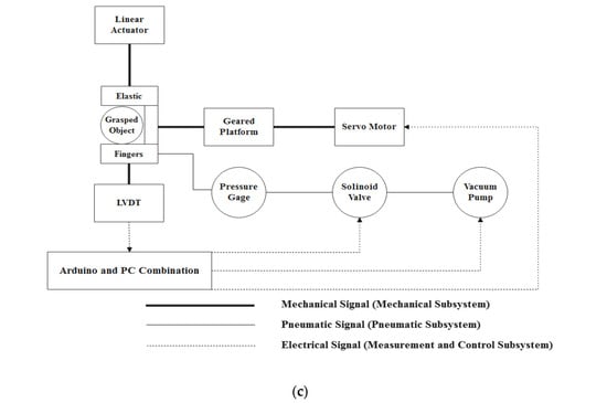 Following the characterization of the stiffness of individual fingers, a two-finger robotic hand was designed and fabricated, as shown in Figure 2, where the jamming of the granular media was controlled using a vacuum pump (Kamoer HLVP15-AU24). At the same time, the pressure was measured using a pressure gauge and maintained using a solenoid valve (generate Model 2W-025-08). The two-finger hand was moved horizontally by a geared platform powered by a servomotor (PFN-13ED04D) to control the gripping functionality. Before starting a test, the fingers were checked to ensure a leakage-free state by monitoring the pressure gauge reading. According to the type of signals transferred in the system during operation, the system can be divided into three subsystems: mechanical, pneumatic, and measurement and control, as demonstrated by the block diagram in Figure 2. The mechanical subsystem consists of the load and torque applied to the fingers and grasped object, respectively. The pneumatic subsystem applies and maintains the vacuum pressure inside the elastic fingers. Finally, the measurement and control of the displacement of the grasped object is achieved through the measurement and control subsystem. The demonstration of the operation was performed in two steps. The two-finger hand’s load-carrying capacity was estimated at different servomotor-applied torques and different vacuum pressures. The latter was varied between 0 and 0.5 bar, while the former was changed from 1.16 N-m to 1.42 N-m, where, according to the instruments’ specifications, the maximum allowable applied torque and vacuum pressure were 1.42 N-m and 0.5 bar, respectively. Figure 2a shows the mechanism used to estimate the load-carrying capacity. At each combination of vacuum pressure and torque, an axial load was applied through the linear actuator (LA-M-12-40-30-50/105) attached to the grasped object until the object started to slide away from the fingers. A linear variable differential transformer (EVAL-CFTL-LVDT-ND) recorded the sliding action. The load corresponding to the onset of sliding was considered the critical load, above which grasping stability is lost.