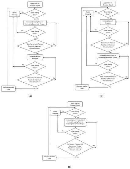 Second, the performance and control of the two-finger robotic hand were investigated and characterized. An axial load was applied to the grasped object as a step input until slippage started. Concurrently, the mechanism adopted was prohibited from sliding by varying the applied torque and the vacuum pressure using one of three different control procedures (Figure 3). The Arduino board was programmed according to the algorithm of each procedure (i.e., the individual flowcharts in Figure 3). Regardless of the control procedure, the input signal was the load applied on the grasped object, while the output signal was the sliding motion sensed by the displacement transducer. The LVDT signal was also considered a feedback signal for the servomotor and the vacuum pump to adjust the grasping force to prevent sliding. At the initiation of sliding, and according to the first procedure, Figure 3a, the servomotor was activated by the feedback signal; hence, the applied torque started to increase until sliding stopped. If sliding persisted until the maximum allowable torque was reached, then the vacuum pump was activated to reach stable grasping, i.e., no sliding. In the second procedure, Figure 3b, the vacuum pump was first activated according to the feedback signal. The vacuum pressure started to increase to suppress sliding. If sliding continued until the maximum allowable vacuum pressure was attained, then the grasping force was increased by activating the servomotor until a stable grasping condition was approached. In the above two procedures, the activation of either the servomotor or the vacuum pump was conducted sequentially, or, as one stopped, the other started. In the third procedure, as described in the flowchart in Figure 3c, the servomotor and the vacuum pump were concurrently activated after receiving the feedback signal from the controller. In the third control procedure, both the applied torque and vacuum pressure were increased simultaneously until the stable grasping condition was reached. It is clear that the adoption of the above three procedures is due to the main factors affecting grasping, namely the vacuum pressure and the servomotor torque. Each one was varied separately in the first two procedures, while in the third procedure, both factors varied simultaneously.