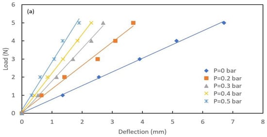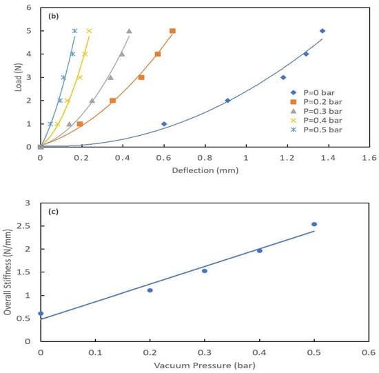 One of the main promising advantages of the investigated flexible fingers is the ability to tune or vary the stiffness on demand throughout the grasping process. Hence, flexible fingers can potentially grasp different objects with various shapes without deforming or crushing these objects. The flexible finger’s overall variable stiffness comprises two components, namely bending or structural stiffness and surface contact stiffness, as discussed before. The relationships between the applied load and the resulting deflections (bending and surface) are shown in Figure 4. For the case of bending stiffness, Figure 4a shows the linear relationship between load and deflection regardless of the vacuum pressure used in the jamming process of the granular media within the finger cavity, where the elastic finger behaves as a cantilever beam. This monotonic relationship implies that stiffness has a constant value of 0.75, 1.25, 1.82, 2.07, and 2.67 N/m for vacuum pressures of 0, 0.2, 0.3, 0.4, and 0.5 bar, respectively. On the other hand, Figure 4b reports the nonlinear relationship between load and deflection for the surface contact loading due to the Hertzian contact behavior between the solid grasped object and the elastic finger. The results in Figure 4b signify the ability to tune the contact stiffness, i.e., grasping effectiveness, as a function of the applied load and vacuum pressure, where the slope of the force–deflection curve is the tangent contact stiffness. Interestingly, the contact stiffness at maximum load was found to be nearly constant at a value of 48.5 N/mm at the highest vacuum pressure used in this experiment (0.5 bar). The plateau of the contact stiffness at a high load and vacuum pressure is attributed to the saturation of the jamming process, where the application of an additional vacuum does not yield any noticeable increase in the compaction of the granular media.