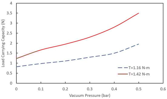 The load-carrying capacity of the two-finger hand as a function of vacuum pressure and applied torque, where the area under each curve constitutes the condition of stable grasping for this specific torque.