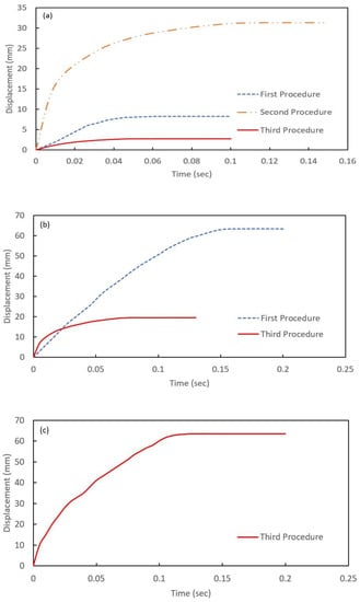 The dynamic response of the two-finger hand for the first loading case (i.e., 1.5 N) using the three control procedures is presented in Figure 6a. The fastest response to attain a stable grasping condition was achieved by the third procedure within 48 ms, followed by the first procedure within 59 ms, and the slowest response is from the second procedure within 110 ms. However, the sliding distance of the grasped object to stable grasping is less for the third procedure, as compared to the other two procedures. The displacement–time histories based on the first and third procedures when the load increased to 2.5 N are shown in Figure 6b. The time to achieve stable grasping was found to be 150 ms and 70 ms, respectively. In the case of 2.5 N, stable grasping was not attained using the second control procedure. Finally, for a load of 3.5 N, the third procedure was the only schema able to achieve stable grasping within 120 ms, as shown in Figure 6c. Therefore, the most effective procedure to reach stable grasping is the third procedure, whereas the first and second procedures fail to attain a stable grasping condition as the load carried by the grasped object increases.