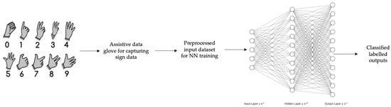 This data glove contains five flex sensors embedded on each finger of the hand and a gyroscope sensor attached to the top of the palm []. According to the posture orientation for standard numeric (ASL), as shown in Figure 1, the dataset is collected for thirty-seven different sign postures. These sign postures include data for the digit numbers 0 to 10 and from the letter A to letter Z. Self-collected thirty-seven separate postures data are used to train the fully connected bilayered and trilayered neural networks. A scaled conjugate gradient back propagation-based algorithm is used to perfectly classify these sign data. Listing all the deployments of the designed model, the whole procedure consists of the following points.