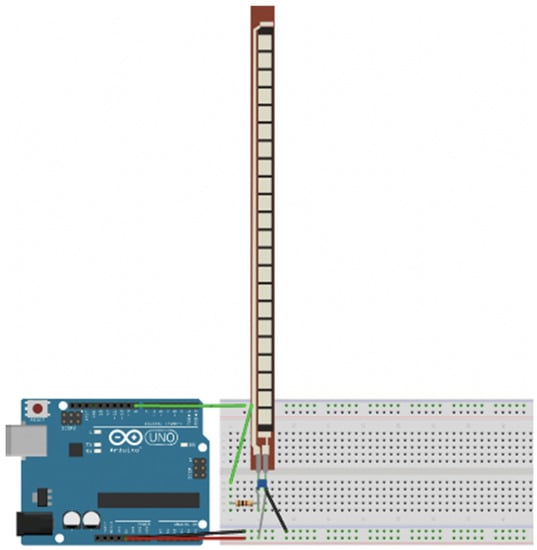 A simple interconnection of the flex sensor with the Arduino microcontroller.