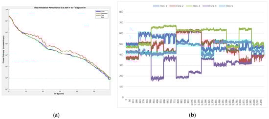 The number dataset contains sensor information for eleven distinct stances. These stances incorporate information from numbers 0 to 10, hence this is an 11-class problem. Training of the neural network results into a display of performance in the form of training, validation, and testing plots occurred. These plots provide information concerning epochs and cross entropy of the model under progress. The blue line indicates training, the green line reflects validation, the red line displays testing, and the dotted line highlights the best performance of the model. The best validation performance for digits is 9.1511 × 10−7 at the 59th epoch, as shown in Figure 4a. For digit classification, only flex sensors are utilized. Therefore, the value ranges for five flex sensors are listed on the y-axis and the total number of sign gestures for 11 numbers of ASL sign postures are displayed on the x-axis of Figure 4b. Each color represents each flex sensor attached to the prototype.