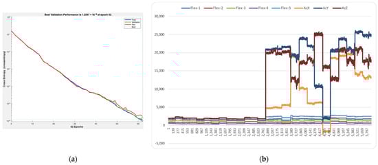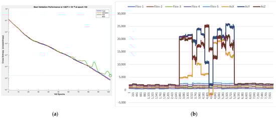 Training, validation, and testing performance plot (a) along with flex sensors values plot (b) for the alphanumeric dataset.