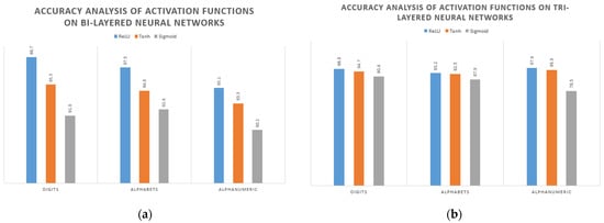 Activation functions play a very important role in updating the weights of the neural nodes during training. Choosing the correct and most appropriate activation function for your model helps in achieving good accuracy and training results. The authors in this paper also adopted the strategy of analyzing the impact of activation functions on the performance of the neural networks by using three different activation functions i.e., ReLU, Tanh, and Sigmoid. Replicating the same experiment by changing the activation function results in different accuracies, as listed in Figure 7 below. This experimental strategy is repeated six times by taking three types of activation functions on a bilayered neural network shown in Figure 7a and then implementing the same three types of activation functions for the trilayered neural network shown in Figure 7b. The analysis states that for the bilayered neural networks, ReLU has the highest accuracy for all formats of the dataset, i.e., number, alphabetic, and alphanumeric. Tanh stands second in this implementation and sigmoid lags due to the mathematical behavior of the function. The same is the case in the trilayered neural network model. ReLU performs very well by providing the best results for number, alphabetic, and alphanumeric datasets. Tanh stands second and sigmoid is in the last stage in this comparison. All these model values are also listed in Table 1.