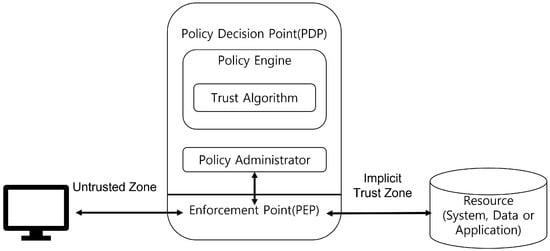 Zero trust is a security concept in which requests for access to resources are not trusted but continuously verified. Figure 1 shows the zero trust access. The core of zero trust comprise the (1) policy decision point (PDP) and (2) policy enforcement point (PEP). The PDP determines the policy set by the company regarding whether resource access is allowed, and the PEP allows or disallows all access according to the policy. In particular, users who request access to resources in a system that implements zero trust are allowed to access the resources after receiving verification via the PDP and PEP [,,].