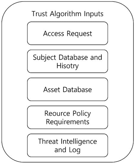 The PDP is similar to the brain of zero trust. Within the PDP, the trust algorithm is used to ultimately determine whether users’ resource access requests will be granted according to the policies set by the company. The trust algorithm is a planned process that is used to determine whether access to a resource is allowed. Figure 2 shows the trust algorithm considers the following sources: (1) access request, (2) subject database and history, (3) asset database, (4) resource policy requirements, and (5) threat intelligence and logs [,]. Figure 3 below illustrates the relationship between the trust algorithm and risk scoring in a zero trust.