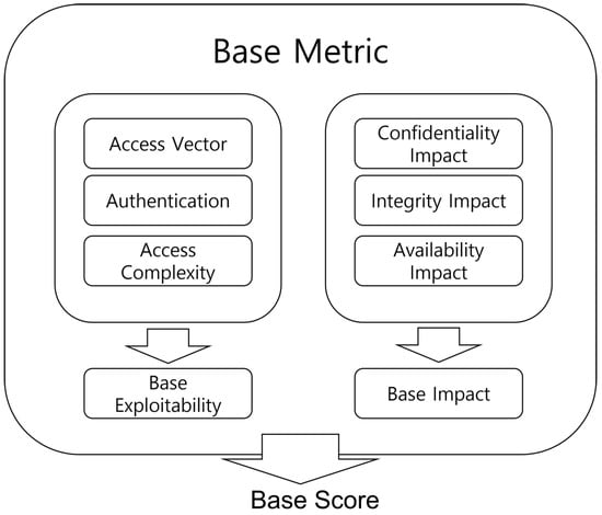To use device risk scoring in their security systems, companies can use their own algorithms or consider the use of a standard scoring framework for device security configurations, such as the CCSS. CCSS is a risk-scoring framework through which analysts can use three types of metrics (base, temporal, and environmental) to evaluate the vulnerabilities of IT system security configurations []. The base metrics measure vulnerabilities in devices’ basic configurations. Temporal metrics measure the expected rate of reduction in threats due to the attack cycle and supplementary measures. Environmental metrics measure values regarding the environment that is used to calculate the base metrics and temporal metrics. Here, the term “environment” refers to aspects such as the IT system’s facilities. When the CCSS framework is used, the base metrics must be used. The other metrics can be used optionally, but there are constraints on applying them to complex corporate-level system architectures. Therefore, this section only discusses the base metrics [,,].
