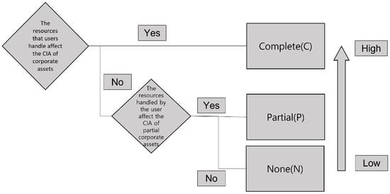 This section explains the dynamic importance value generation flow chart. In Figure 6 and Figure 7, the dynamic importance metric vectors are added to the CCSS scores and used in the risk-scoring algorithm. Accessible resource and resource importance, which are elements of the dynamic importance metric, are evaluated according to the effect that user permissions have on CIA. For accessible resource, the metric’s value is set as none, partial, or complete by comprehensively considering whether the user can access confidential or important resources or has permission to add, modify, or delete resources.