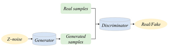 GAN is an unsupervised generative model proposed by Goodfellow et al. in 2014, which is created based on zero-sum game theory and mainly consists of a generator G and a discriminator D [20]. The architecture of a basic GAN is shown in Figure 1. The generator obtains the generative sample G(z) from random noise z, and the discriminator is used to discriminate whether the input sample is a real sample x or a generative sample G(z). Through iterative adversarial training, the performance of the generator and the discriminator are simultaneously improved, eventually reaching Nash equilibrium. The loss function of GAN is defined as: