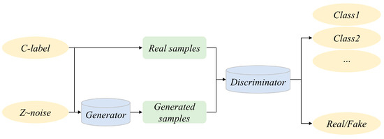 where Lsource denotes the loss function used to measure the validity of discriminating samples from x, Lclass denotes the loss function used to measure the validity of sample categories, and cr and cg are labels of x and G(z,cg), respectively. P(c = cr|x) and P(c = cg|G(z,cg)) are the conditional probability distributions of class labels x and G(z,cg), respectively. During adversarial training, the discriminator is trained to maximize Lclass + Lsource, while the generator’s goal is to maximize Lclass − Lsource.