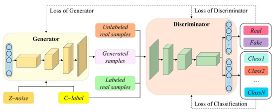 where LG and LD represent the loss functions of the generator and the discriminator, respectively; and represent the supervised loss and the unsupervised loss of the discriminator, and , are the ratio factors; Pr(x) and Pr(x,y) are the prior distributions of labeled real samples and unlabeled real samples, respectively; c are labels of labeled real samples; and P(c = c|x) and P(c = c|G(z,c)) are the conditional probability distributions of class labels of labeled real samples and generated samples, respectively.