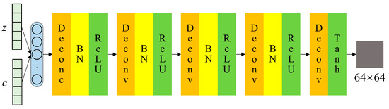 The generator’s input is a 200-dimensional Gaussian random noise vector z with a label vector c. The label vector is first embedded in the noise vector through an embedding layer, followed by deconvolution layers to generate fake samples whose sizes are 64 × 64. The generator contains five deconvolution layers, and the activation function of the first four layers is ReLU, which helps the generator achieve non-linear representations and makes the network easier for training. The activation function of the last layer is Tanh, which limits the output to [−1,1], and BN is executed after each layer to speed up the training convergence and avoid overfitting. The specific structure is shown in Figure 5, and the detailed parameters are shown in Table 1.
