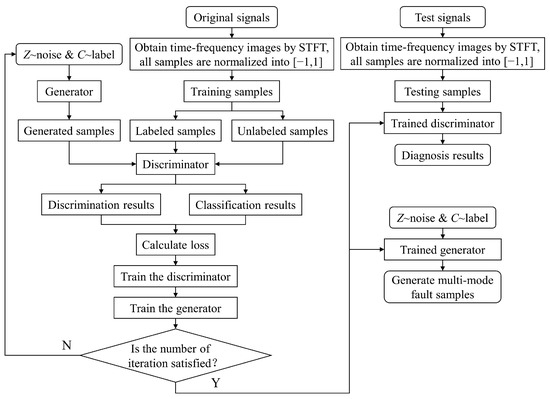 A fault diagnosis method based on STFT-SACGAN is proposed, using the ability of STFT to process non-stationary signals. The original one-dimensional vibration signals of bearings are converted into two-dimensional time-frequency images by STFT as the input of SACGAN. The multi-mode fault sample generation ability of the generator and the recognition ability of the discriminator are improved by adversarial training. The flow of the proposed method is shown in Figure 7, and the main steps are as follows: