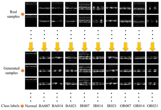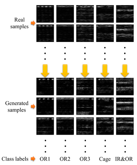 The sample generation ability of the generator is usually verified by evaluating the quality of the generated samples. In this case study, the SAGAN is trained using training samples with a labeling ratio of 0.2 (40 labeled samples and 160 unlabeled samples of each class). The diagrammatic sketch of the real samples and the generated samples is shown in Figure 10. The generated multi-mode samples are highly similar to the real samples.