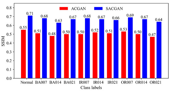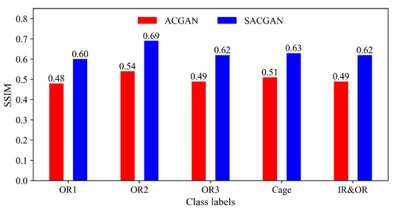 For a more objective evaluation, the structural similarity index measure (SSIM) is used to quantitatively evaluate the quality of the generated multi-mode samples. The SSIM aims to measure the similarity of two images from brightness, contrast, and structure. The range of SSIM values is the interval [−1,1], and larger SSIM values indicate higher similarity between two images [29]. In contrast, the labeled training samples are also used to train the ACGAN, where the parameter structure of the ACGAN is the same as that of the SACGAN. Five pairs of the real samples and the generated samples of each class are randomly selected, and the average SSIM values of the ACGAN and the SACGAN are given in Figure 11. The results show that the average SSIM values of each class of the SACGAN are always larger than those of the ACGAN, meaning that the samples generated by the SACGAN are closer to the real samples.