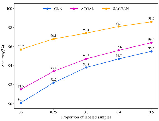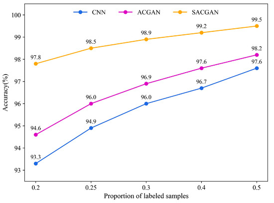 Each class’s training samples are divided into labeled and unlabeled samples in different ratios to train the SACGAN. The labeled samples are also used to train the ACGAN and the CNN model for comparison, where the parameter structure of the ACGAN is the same as the SACGAN. It is worth mentioning that to verify the effectiveness of the discriminator’s structure, the CNN model here is the discriminator of SACGAN that can perform supervised learning. Each group of comparative experiments is repeated ten times, and the average recognition accuracy of the test samples at different label ratios is given in Figure 12. The results show that all three models have high recognition accuracy, indicating the effectiveness of the discriminator structure; the ACGAN and the SACGAN effectively improve the recognition ability of the discriminator through adversarial learning; limiting the number of labeled training samples has a greater impact on the fault recognition ability of the ACGAN and the CNN and the SACGAN can weaken the influence of decreasing labeled training samples and has the highest recognition accuracy under different label ratios.