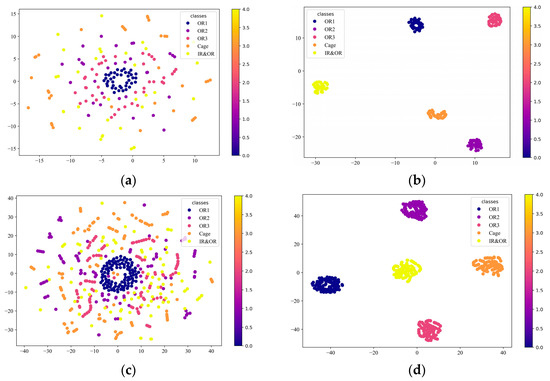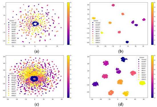 Visualization of feature distribution for XJTU-SY data. (a) Labeled samples before training; (b) labeled samples after training; (c) test samples before testing; (d) test samples after testing.