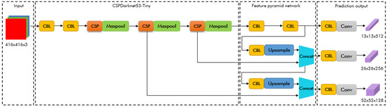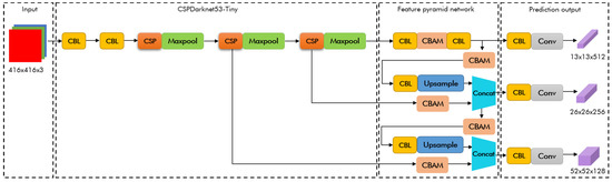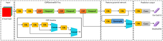 YOLOv4-tiny [32] is a series of simplifications based on YOLOv4 that removes the spatial pyramid pooling structure and path aggregation network, resulting in a network with one-tenth the number of parameters compared to YOLOv4. By employing CSPDarknet53-Tiny as the backbone feature extraction network and replacing the Mish [33] activation function with the LeakyRelu [34] activation function, YOLOv4-tiny simplifies its network structure while enhancing the detection speed. YOLOv4-tiny utilizes the feature pyramid network [35], which reduces the network parameters compared to YOLOv4’s PAN network. Figure 1 illustrates the network structure of YOLOv4-tiny.