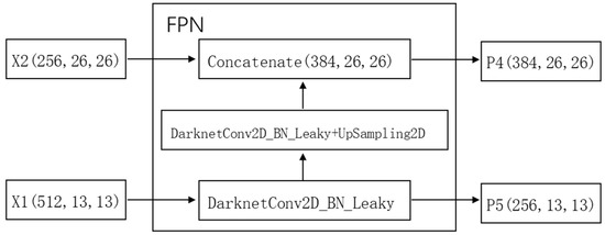 The enhanced feature extraction network of YOLOv4-tiny is simple and significantly reduces the number of model parameters. However, we found that the network only outputs two prediction feature layers, with sizes of 256, 26, and 26 and 512, 13 and 13. Due to the model having only two prediction feature layers, it cannot retain the semantic information of shallow feature layers, leading to a decrease in the detection resolution of objects. This affects the detection of small-size targets and may also cause inaccurate boundary localization for large targets. At the same time, the network has a small receptive field, meaning it can only perceive minor local information in an image and cannot obtain a broader global context. This leads to a decrease in the network’s ability to recognize and classify objects. Figure 2 shows the FPN structure in YOLOv4-tiny.