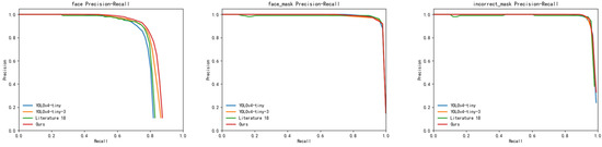 We compared the P-R curves of our proposed algorithm, YOLOv4-tiny, YOLOv4-tiny-3 and literature 18 for face target detection results under the same experimental conditions and methodology, as shown in Figure 8. The results indicate that the YOLOv4-tiny-3 algorithm outperforms YOLOv4-tiny and literature 18 on unmasked targets (face) based on the P-R curve and the area formed by the X axis and Y axis, which represent the AP value. It can be observed that even after adding a predictive feature layer to expand the detection scale, the algorithm still retains feature information of small targets after down-sampling, which improves small target recognition and enhances network detection accuracy. Our proposed algorithm outperformed the YOLOv4-tiny-3 algorithm in terms of accuracy on face targets. By using an attention mechanism within the feature-enhanced network, our algorithm filters out non-critical target information and concentrates on the vital face region. Consequently, this improves the network’s ability to detect faces with increased accuracy. Our proposed algorithm’s performance on correctly worn mask targets (face_mask) and incorrectly worn mask targets (incorrect_mask) aligned with the other two algorithms. This was primarily due to the YOLOv4-tiny algorithm’s superior detection accuracy on these targets, limiting the algorithm’s capability to make any significant improvements.
