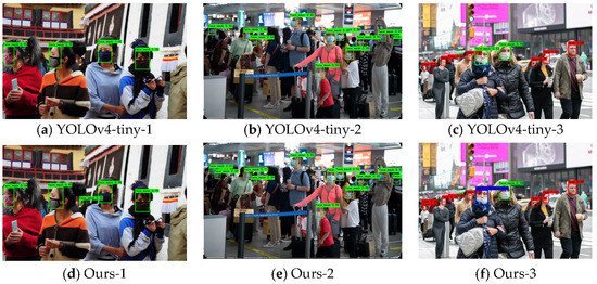 Additionally, image (c) shows that the YOLOv4-tiny algorithm incorrectly detected an improperly masked target as correctly masked, while image (f) demonstrates that this paper’s algorithm detected all targets accurately. This improvement resulted from integrating an attention mechanism into the enhanced feature extraction network of YOLOv4-tiny, along with the utilization of focal loss and an improved mosaic data enhancement strategy. These enhancements effectively enhanced the model’s feature extraction ability.