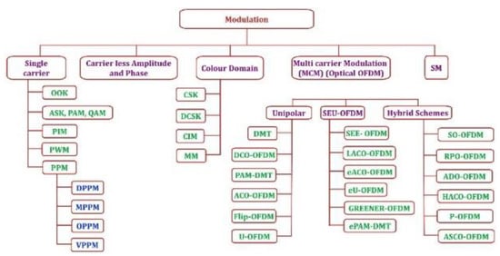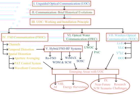 Recently published review papers have addressed only a few topics [9,10,11,12,13,14]. However, minimal review works reported on a comprehensive evaluation of UOC systems/techniques, all the way back to ancient man’s fire to present-day AI-supported UOC technology. This coextensive review will benefit many readers considering that near-future high-data-rate wireless networks will benefit from the integration and operation of UOC systems individually and together (combined version) with RF signals. To the best of our knowledge, no review paper covers the entire roadmap of UOC, as in Figure 1.
