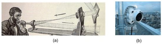 The year 1876 was a significant one for Alexander Graham Bell. Having come to the U.S. as a teacher for the deaf, he had been trying to figure out a way to transmit speech electronically. Despite little support from his friends, he successfully invented the telephone in March of 1876 [3]. In 1877, Thomas Alva Edison demonstrated a phonograph system using an acoustic mechanism for recording sound signals. In the 19th century, A. Graham Bell demonstrated the “photophone,” as shown in Figure 2a, where light beams were used for the transmission of acoustic signals; this was not taken further but set the foundation for wireless transmission using light [16]. In 1893, Nikolai Tesla was able to transmit wireless RF signals successfully. Following that, in 1896, Marconi was successful in transmitting RF signals over a 2 km distance [17]. Alexander Graham Bell was back in the history books again after he made the first coast-to-coast call by phone to his assistant in January of 1915. It was the first long-distance call made in history from a landline. It has significance because it made long-distance communication all over the country a reality [3]. In 1927, the first wireless communication using the telephone was established between England and the USA [5,18]. In 1930, the company named “American Telephone & Telegraph” demonstrated the videophone. In 1934, wireless communications were established between the USA and Japan. In 1936, in Germany, videophone connectivity was used for communal purposes. In 1946, the introduction of a voice mobile phone calling system was demonstrated. In 1956, a telephone link with 36 circuit cables was established between Scotland and Newfoundland. In 1962, the first wireless space satellite communications were demonstrated for the first time. In 1964, George Hockham and Charles Kao verified voice communications using light over fiber-optic cables for the first time. Following the invention of the laser, fundamental and ground-breaking steps were taken in terrestrial long-distance communications [3,19]. The availability of coherent laser sources opened new opportunities for light-based communication. In 1965, the picture phone trial was initiated, while in 1969, the first internet service between a few computers in four universities in the USA under the Advanced Research Projects Internet Advanced Research Projects Agency Network (ARPANET) was demonstrated. Inventor Martin Cooper placed the first cellular mobile call in 1973 to his rival at Bell Labs, Joel Engel. The first mobile phone had a maximum talk time of 30 min, and it took a year for the battery to recharge. The phone would eventually be a prototype for Motorola’s first mobile phones [3,5,6,7]. In 1979, because of the judgment and necessity of INMARSAT, naval boats were connected for security and safety communications. In 1981, Japan deployed a communal automatic mobile network. This was followed by a secured and limited amount of internet data transmission for the emergency services, corporations, and researchers of a few universities in 1982 [5,6].