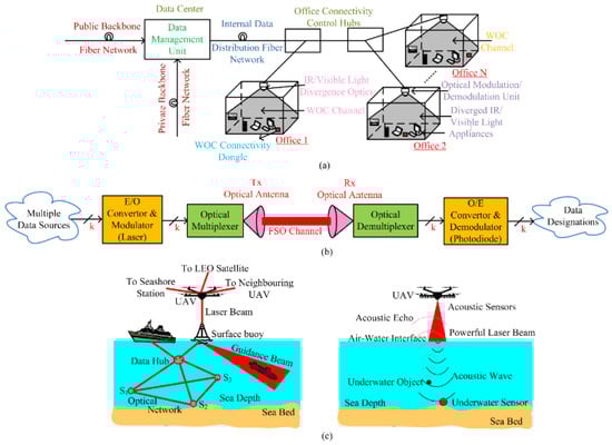 (a) The architecture of a WOC network installation; (b) a ‘k’ baseband channel FSO communication system; and (c) OWC systems.