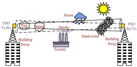 The unique features and benefits of FSO systems come at the cost of the uncontrollable atmospheric channel effects. In fiber-optic communications, the amount of power obtained at the detector end is well-known, while, owing to agitation variations in the open atmosphere and spatially scattered route impacts, an FSO system has a number of dynamic inhomogeneous and random power fluctuation issues. Thus, the data-carrying light signal transmitted through the atmosphere decides the output of FSO systems. As depicted in Figure 4, fog, ice, polluted air, haze, desert, turbulence speed variations, building motion, etc., have a significant impact on optical beam transmission [15,16,17]. Water dewdrops and aerosol units with a diameter of a few hundred microns will change the properties of a light wave as it propagates, and as a result, we obtain a random wavefront value, which results in signal amplitude and phase fluctuations. By the mutual action of the absorption, scattering, and reflection of the atmospheric particles [9], link availability is greatly limited and the system BER is, therefore, increased [44]. Similarly, fog absorbs a lot of visible and infrared light. An FSO system’s environmental loss is similar to an RF system’s rainfall loss [14]. These massive ambient channel molecules expand or decay in response to moisture levels, and their impacts can be calculated using the Rayleigh or Mie scattering principle because of the spectrum of light and molecule dimensions [27]. Photonic attenuation for atmospheric absorption spectrum and extinction varies with the optical range, with higher wavelengths having more attenuation, i.e., the air molecules feebly interfere with the optical field above one micrometer [45]; as a result, optical scattering becomes negligible. A prime criterion for the effective connection of an FSO system is the specification of the optical wavelength in compliance with local climatic factors. The discrepancy of ambient intensity disturbance in the light system, due to the solar non-uniform heat of channel air pockets, is the primary cause of the light beam reference that we set at the detector. At the output port [46], scintillation causes intensity/phase variations over time, which must be dealt with via statistical approaches. In short-distance communication (<1 km) light signal transmission, the scintillation properties are negligible, whereas, in medium-(≤3 km)/long (>3 km)-range communication, they become one of the most important factors affecting an FSO system’s overall efficiency and reliability. Air temperature, moisture, pressure, height, the spatial geography of the implementation location, wind direction, and other environmental conditions, all influence the power level of FSO channels [46].