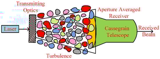 where wave number is denoted by k (k = 2π/λ). According to Equation (11), for smaller apertures, i.e., ((kD2/4L) << 1), F is 1, and for bigger apertures, (kD2/4L >> 1), with an increase in aperture size, there is a decrease in the power variance. Thus, an aperture averaging technique becomes essential for reducing the variations in received power in strong atmospheric conditions. Figure 5 shows a brief illustration of the aperture averaging of the received optical signal. An aperture-averaged optical antenna, e.g., a Cassegrain type telescope, gathers most of the photon particles that reach its aperture [54]. Usually larger-aperture antennas are used to collect the entire photons entering it; hence, the scintillation induced in received power due to turbulence variations are reduced. In practicable FSO system installations, when choosing the aperture of the receiver, there will be a trade-off between the weight, the optical transmitting receiving antenna size, and potential agility.