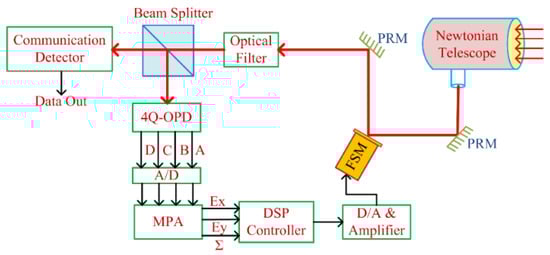 A digital signal processing (DSP) controller is built in the system which uses the information of the centroid position of the beam (Ex and ) to generate control data that steers and steadies the arriving beam to center it on the detector plane. The FSM obtains the control data via a digital-to-analog converter (DAC) and a high-power amplifier. To attain high accuracy (in terms of prad) in beam steering, a tri-piezoelectric-actuated platform (or equivalent MEMS platform) is used and a steering mirror is mounted on it [58]. The displacement of the beam’s center is evaluated using a 4Q-OPD and adjusted with a confined controller, resulting in beam steadiness at the detector’s center being refined [59].