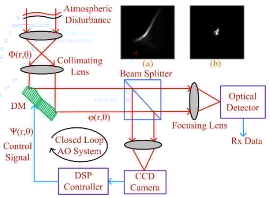 Today’s AO systems are attracting significant attention for both model-free and model-based optical beam phase aberration correction techniques. Figure 7 shows a conceptual configuration of AO-based FSO systems, where a Gaussian beam is transmitted using the laser source from a remote Tx point. As the transmitted beam travels through a turbulence-induced atmospheric channel, its wavefront is aberrated. An optical lens is used in the collection, and the collimation of the arriving beam and is made to fall on the DM. As the beam falls on the DM, it is reflected and is split into two paths: the propagating beam and the reflecting beam. The communication detector detects the propagating beam while the CCD camera receives the reflected beam. To drive the DM to make the aberration-restrained Φ(r,θ) accurate, a DSP controller is used to generate appropriate regulatory signals Ψ(r,θ), which are based on the output of a CCD. This closed-loop process continues if the wavefront aberration remains. The correction of wavefront distortions in the incoming optical beam, i.e., φ(r,θ) in Figure 7, improves the coupling efficiency and, consequently, the quality of communication. The performance capability of the AO system is determined by a metric known as “Strehl ratio” (SR) [65]. A higher SR means a better performing system. In Figure 7, the inserts (a) and (b) show the beam profile without and with the AO device, respectively. In-depth discussions on other control techniques of the measurement of wavefront aberrations, wavefront corrections, and control algorithms are available in [64,65]. High-speed wavefront aberration measurement and correction is crucial in FSO communications because of high data rates. As mentioned in [63], present-day FSO–AO systems suffer from a poor rate of speed of wavefront correction, which invites the need for real-time high-speed (nano second), high-accuracy (prad) actuators and their controllers.