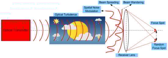 As can be well understood, the media of optical turbulence is a natural process and it cannot be avoided nor can be neglected. FSO as the UOC scheme in free space faces those turbulence effects, as depicted in Figure 8, which is a major problem. The aforementioned major processes along the optical propagation are stochastic processes and could happen simultaneously. Thus, the degradation of performance could become worse if these major processes exist along the optical propagation and are received by the photodiode (PD). Regarding the stochastic process of optical turbulence, there is an opportunity to involve an optical method to reduce or minimize the turbulence effects into optical propagation. Generally, there are two schemes of signal reception in FSO; the first is the direct-detection (DD) method and second is the fiber-detection (FD) method [66,67]. DD is commonly used as the final signal detection in the Rx of FSO. DD receives an optical signal directed by a receiver lens, whereas FD is commonly used as the signal amplification method in order to enhance the signal strength. FD is frequently implemented in the scheme of a relaying network, where a node has a role to amplify an optical signal forward and deliver it into next node of relaying, over several kilometers of optical propagation. FD is also implemented with an optical amplifier such as an Erbium-doped fiber amplifier (EDFA), praseodymium-doped fluoride fiber amplifier, fiber Raman-amplifier or semiconductor optical amplifier [68,69,70].