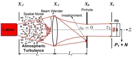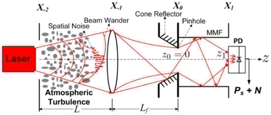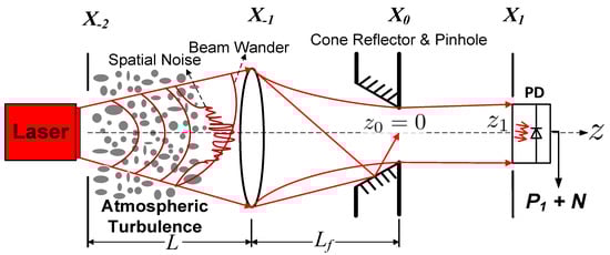 In Ref. [71], an optical method was developed to suppress the noise modulation instead of improving the signal quality input into the PD. The optical method is called spatial filtering, as shown in Figure 9, where a pinhole is used before the optical signal is received by the PD. The result of this method has been successfully reported in filtering spatial noise modulation and suppressing scintillation as well. The output of the signal intensity that governs the pinhole as the spatial filtering is given by