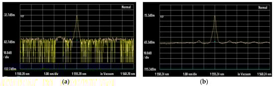 The sample of the signal spectral measurement at 1555.2 nm from the output of DD and the OSF. (a) The received signal for DD without implementing an OSF; and (b) the signal spectral measurement produced by the OSF. Both are under a strong turbulence condition.