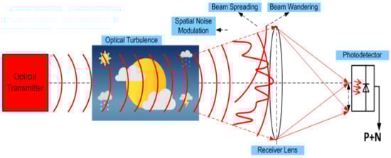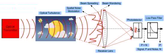For signal detection in the Rx of FSO, PiN and an avalanche photodiode (APD) are widely used as the photodetector [75]. Those two characteristics of PD are determined by quantum efficiency and responsivity. Under turbulence effects, PDs produce greater shot and thermal noise that are initiated by scintillation, background noise, and spatial noise modulation, as illustrated in Figure 13.