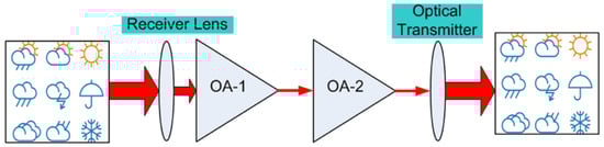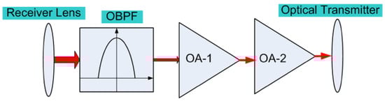 The ORN implementation in FSO can be accomplished with either amplify-forward (AF) or amplify-receive-relaying (AR) configurations, as in Figure 16 [78,79]. However, the implementation of an optical amplifier in the ORN also increases the noise figure (NF), amplified spontaneous emission (ASE), and background noise. These issues can be solved by applying the appropriate fixed or adaptive filters for the reception of the signal in the AR and AF configurations. An optical band-pass filter (OBPF) can be implemented before the amplification process, as in Figure 17 [79,80]. Thus, a received signal by an optical amplifier in the configuration of AF and AR can accept a signal with a minimum of NF, ASE interactions, and background noise. Another issue with an optical amplifier is the fade-out condition whenever the received signal power falls below a threshold level.