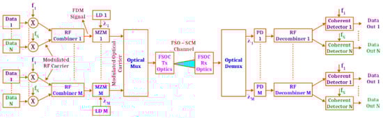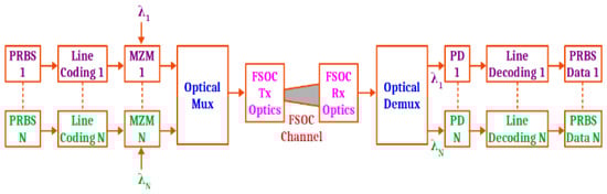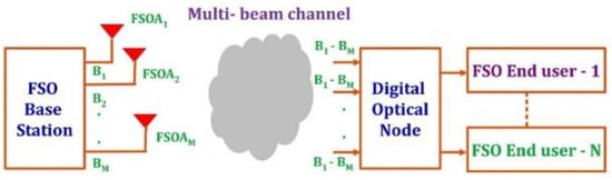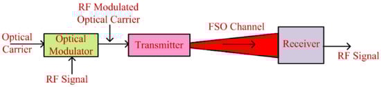 The available data rates of FSO technology are comparable to existing fiber-optic communications. Particularly, the coherence and low divergence of light beams enable the implementation of huge parallel (MIMO) FSO links at certain locations. In addition to ground-based FSO systems, there are other applications for the use of FSO systems such as inter-satellite up/downlinks, communication between a UAV and ground platforms, connectivity between mobile space stations, etc. [20,21,22]. The unique characteristics of a light beam and its coherence make high-data-rate modulation and long-range free-space data transmission possible. An FSO system covering long-distances through the atmosphere uses a highly shaped optical beam [21]. The most popular modulation methods for FSO links are digital pulse-width/pulse-position, digital pulse interval, on-off keying (OOK), and differential phase-shift keying (DPSK) [23]. A digital pulse position modulation (PPM) scheme is very suitable in FSO systems, in multiple scattering environments [24,25]. In communication systems, the channel capacity developed by Claude Shannon in 1949 [23] is given as