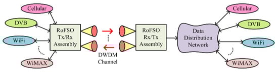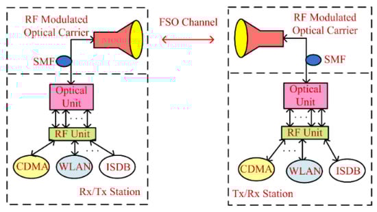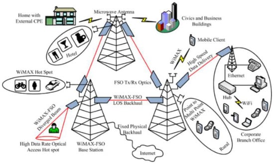 In outdoor/long-range systems, i.e., FSO systems, intense or phase-modulated IR/visible optical beams carrying multi-media-type data from multiple sources are transmitted into free space using optical antennas (telescopes) (see Figure 3b). At the receiver side, an optical antenna is used to collect incoming light for conversion into an electrical signal using a photodetector and an amplifier for further processing to recover the transmitted data stream. Note that 50 Gbps FSO systems are now commercially available for networking applications. Nevertheless, high data rates of 1.6 Tbps have been recently reported in the literature [8]. FSO connectivity can be installed successfully by maintaining a direct path (or drone/HPA-based pend-pipe-supported path) between the transmitter and the receiver antennas. FSO systems have several advantages over RF wireless technologies, including no spectrum licensing, no frequency coordination, no RF-induced interference with other channels, and inherent security (i.e., hard to intercept).