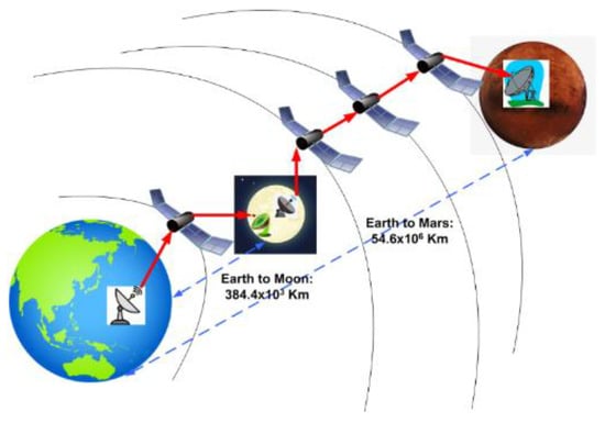 One of the benefits of FSO is that it can be configured with the optical relaying networks (ORN) to expand the distance of the data link between source and destination, as illustrated in Figure 15, wherever the LoS path is unavailable. In the ORN configuration set-up, FSO can reach longer link distances, in the order of 10s/100s of kilometers terrestrially, as it is supported by many nodes to receive, process, and forward the optical signal. The ORN can also support dual and multi-hop to provide communication in computer networks [77]. In the ORN configuration, FSO has no issues with the non-LoS path between Tx and Rx points. The only requirement for an ORN-based installation of FSO communication is the need for an optical transceiver within each node. Thus, the ORN can be adapted to the geography of Earth’s contours through spacing of the nodes, as required, for several kilometers of data link connectivity.